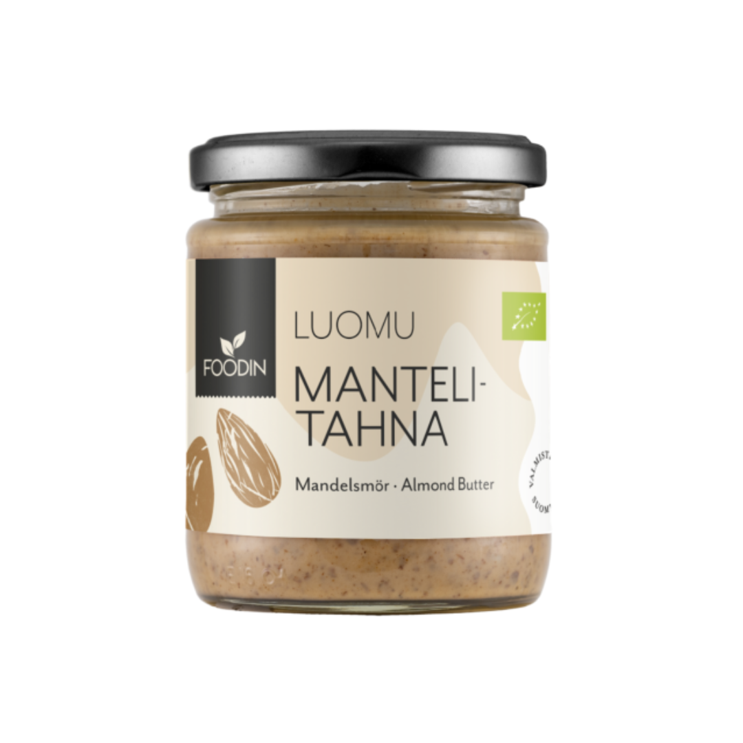 Foodinin herkullisen mantelitahnan valmistuksessa käytetyt mantelit on poimittu ja eroteltu käsin, jotta mahdollisten karvasmanteleiden pääsy joukkoon on pystytty minimoimaan. Tahna valmistetaan Foodinin Vaajakosken tehtaalla paahdetuista luomumanteleista hellävaraisella kivimyllytekniikalla. Hellävarainen valmistusmenetelmä takaa parhaan mahdollisen lopputuloksen niin ravinteiden säilymisen kuin samettisen maun ja tekstuurin suhteen.